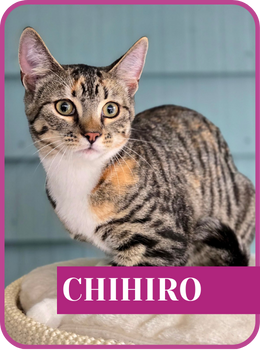 Chihiro is a sweet and affectionate kitten with a more reserved nature than her siblings. She enjoys being close to her people, often leaning against them or sitting nearby. While she occasionally sits on laps, she prefers gentle pets and quiet companionship.