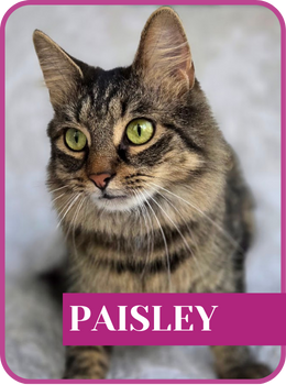 Paisley is a sweet but sassy girl who loves attention on her own terms. She enjoys cuddling on your lap or beside you and loves being held, but she can get overstimulated easily. Paisley is playful when in the mood and very vocal. She’ll “talk” to you with her unique meow, making her a fun and interactive companion.
