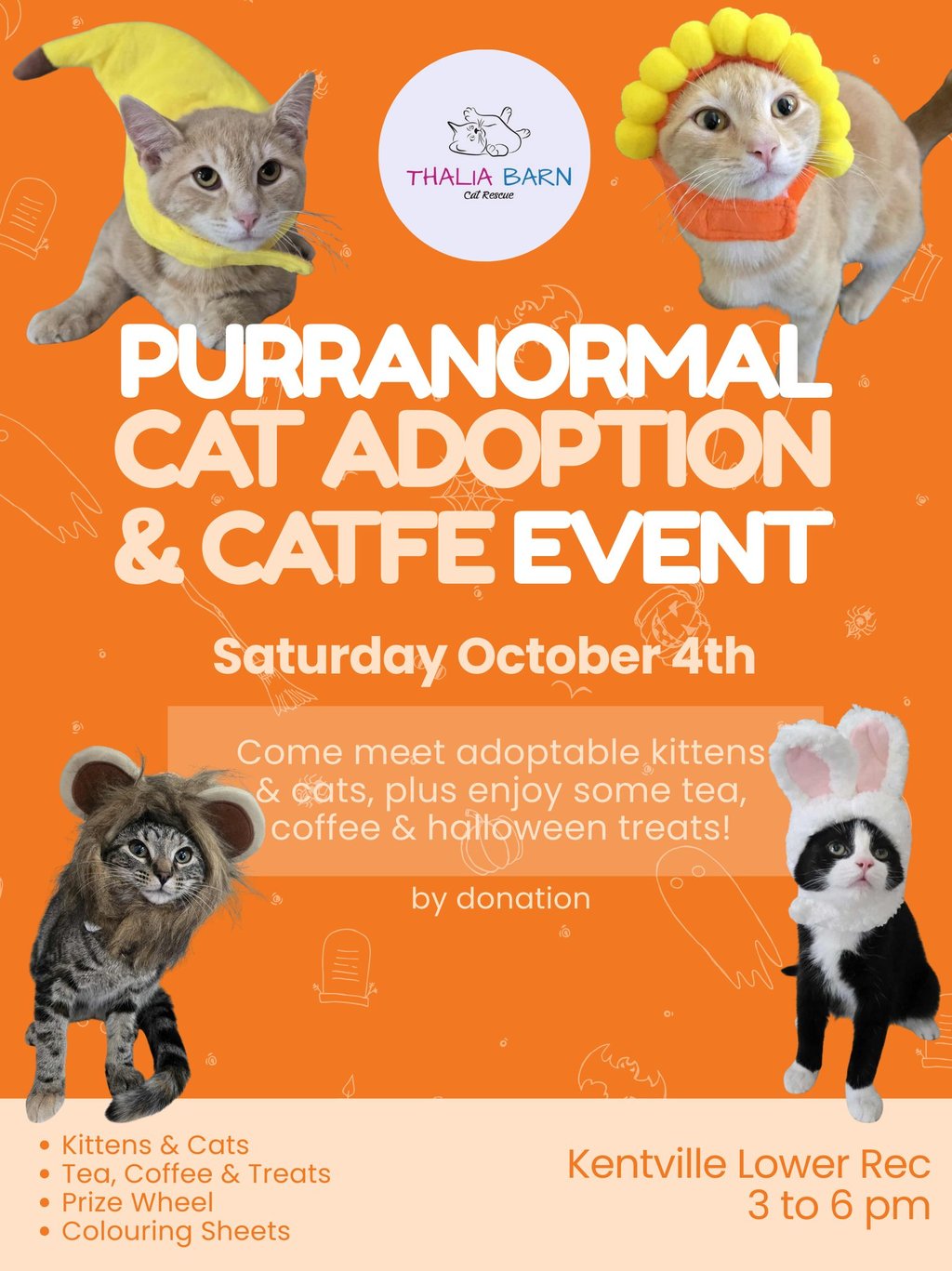 Looking for a furry friend, or just want to interact with some cats (and enjoy some Halloween fun)? Join Thalia Barn Cat Rescue for an afternoon of adoptable kittens and cats, cozy drinks, and family-friendly activities!