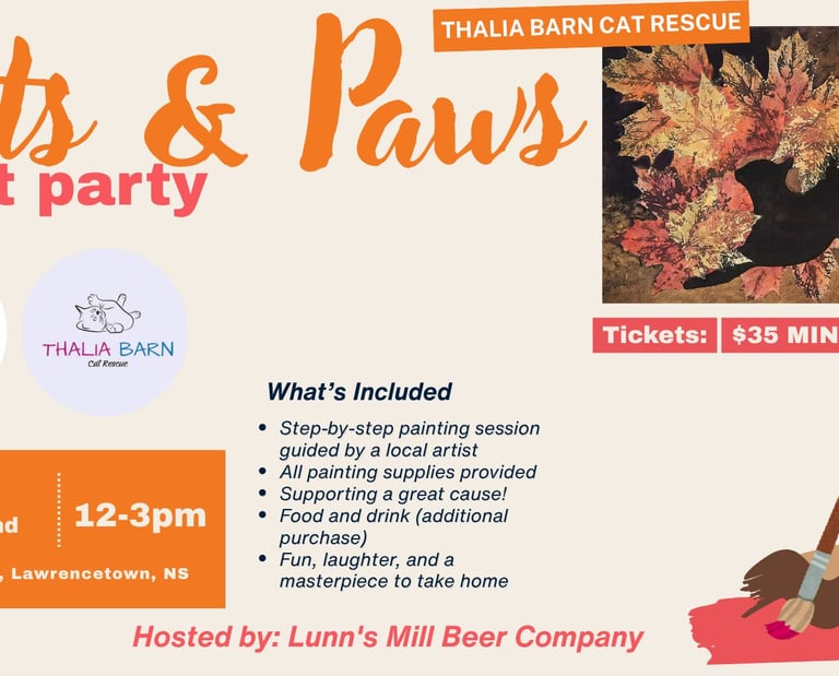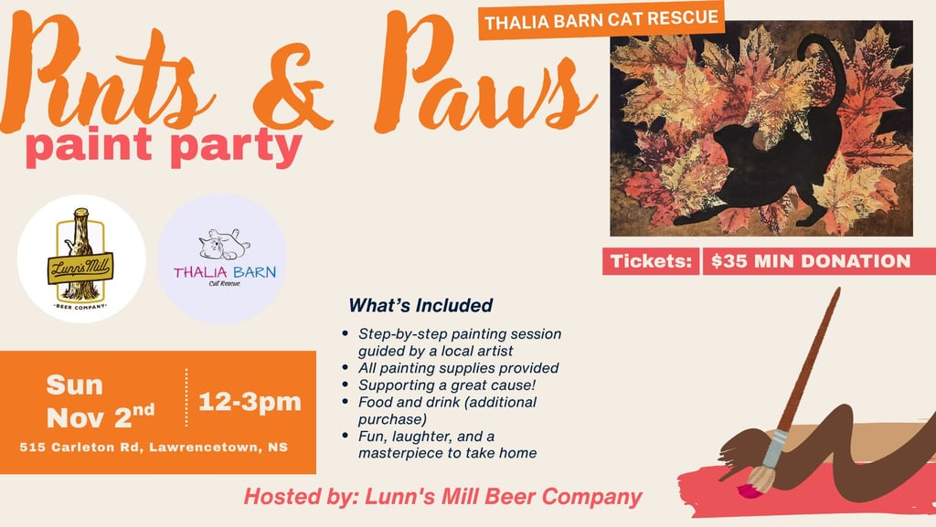 Join us for a cozy afternoon of creativity and compassion at Lunn's Mill Beer Company We’re painting a fall-inspired cat-themed masterpiece with the talented Colette Nap, all in support of Thalia Barn Cat Rescue.