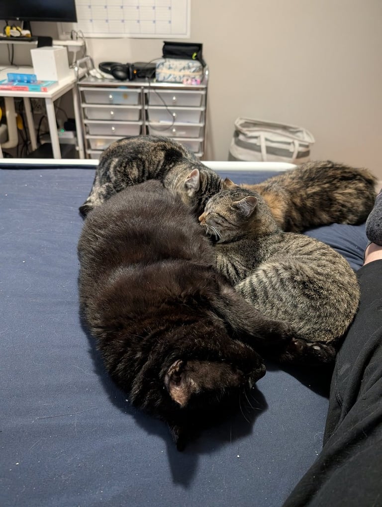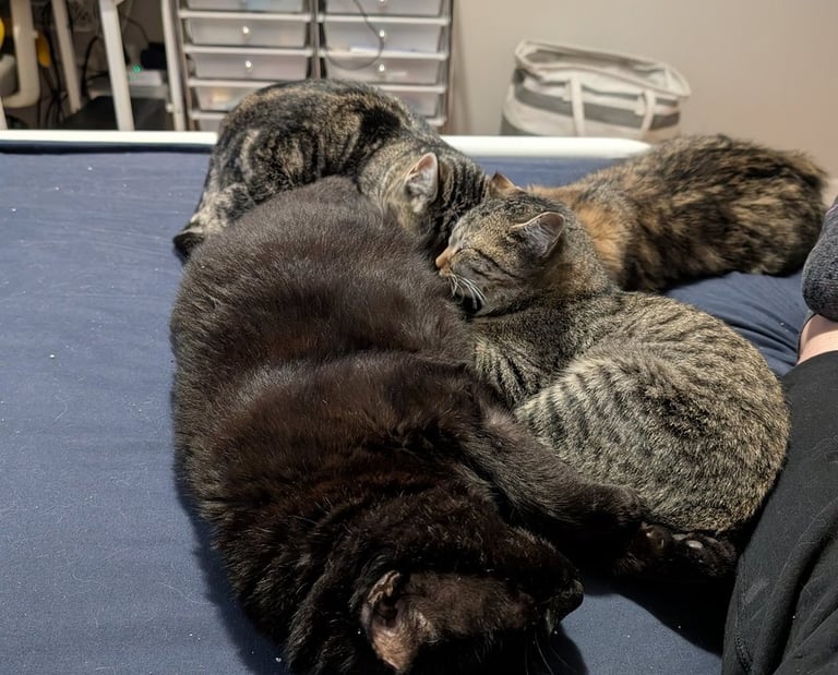 Theo required a little extra attention, including manual bladder and bowel expression, Lactulose for digestion, hydration, and belly massages. But his routine was simple and filled with love. In return, Theo gave endless joy, climbing cat trees and spreading happiness wherever he went.